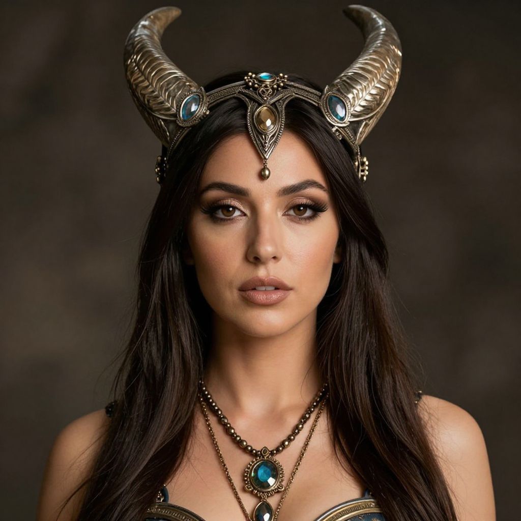 Photograph of a young woman with long, straight black hair and fair skin, wearing an ornate metallic headpiece with large, curved horns. She has dark, dramatic eye makeup and full, nude lips. Her attire includes a black, strapless top adorned with intricate gold and turquoise jewelry, including a necklace with a large turquoise pendant. The background is a dark, blurred gradient, emphasizing her striking appearance. The image has a fantasy or mythical aesthetic, with a focus on her regal and enigmatic presence.