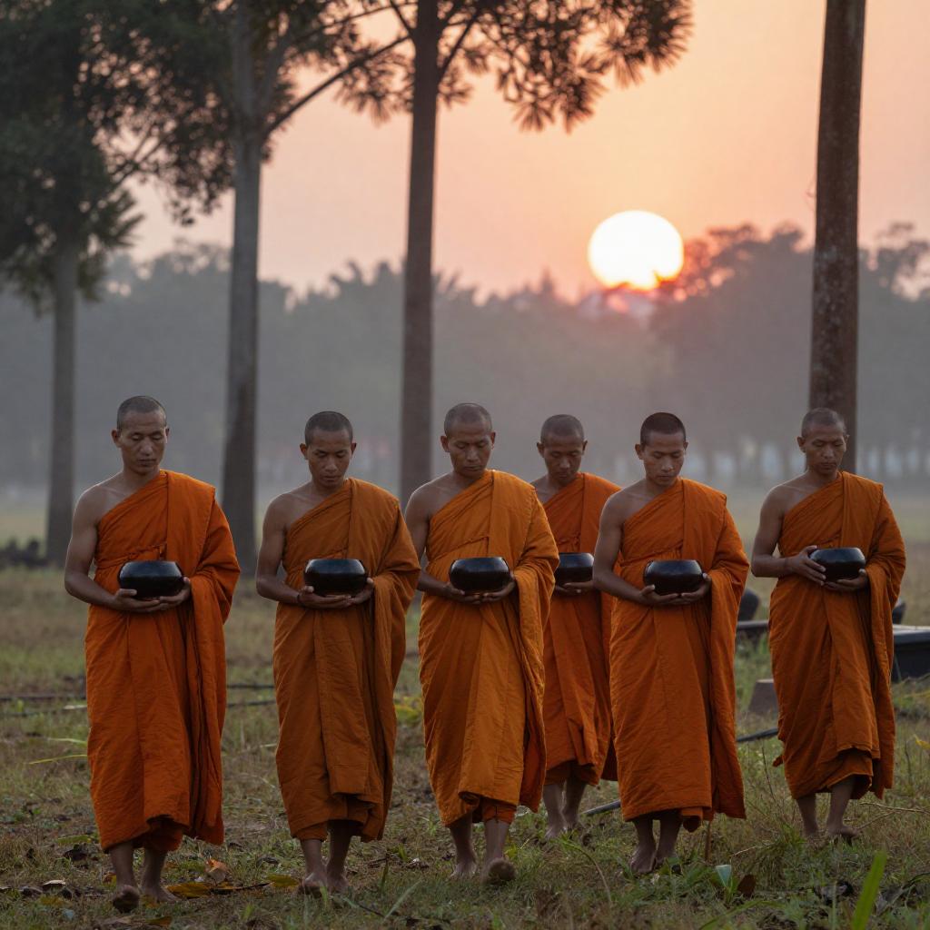 Photograph of five men in traditional Tibetan attire, seated on grassy field. They wear black conical hats, colorful robes—red, blue, yellow, gray, green. Yellow banner with sun symbol in background. Mountainous landscape. Men in line, serious expressions. White round objects in front.