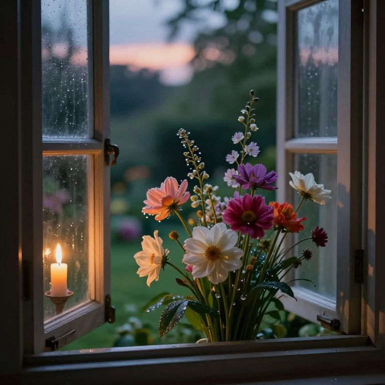 Create an enchanting digital still life reminiscent of classic Dutch paintings, featuring an open window revealing a serene garden at dusk. The composition should include a bouquet of exotic flowers in various stages of bloom, with their petals reflecting the warm glow of candlelight on the glass pane from a unique 'bug's-eye view'. Observe delicate dew drops clinging to the flower stems, glistening like tiny prisms under the soft light, while the colors of the blooms create an emotional gradient that evokes both tranquility and mystery in this ethereal setting.