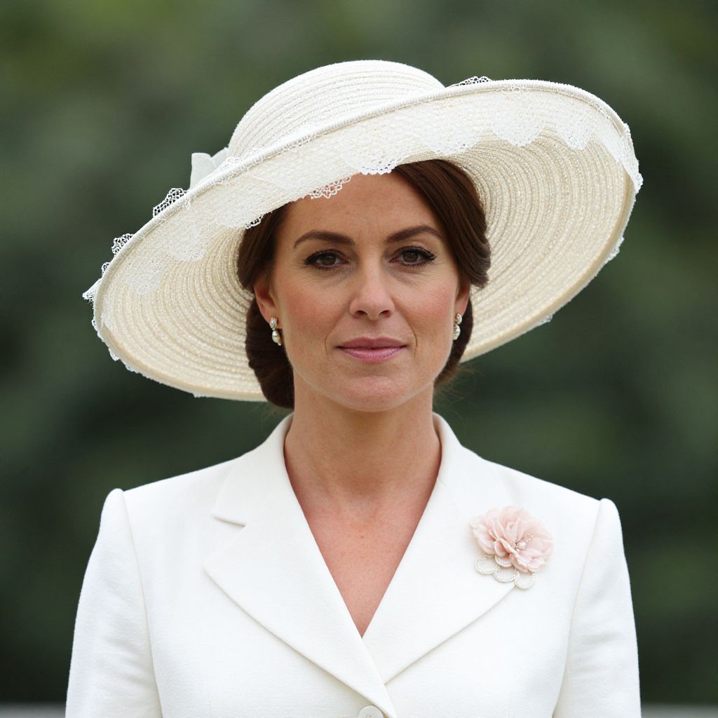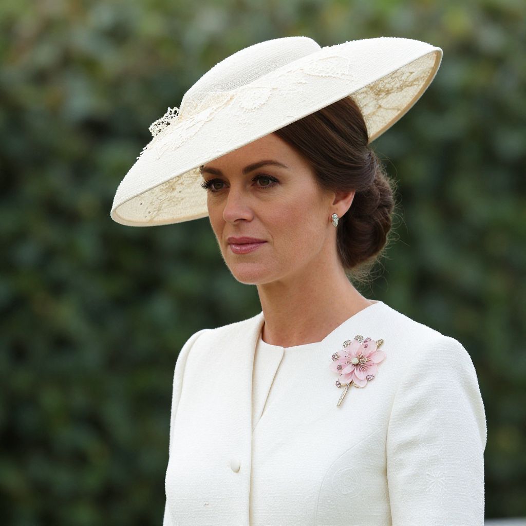 Elegant woman wearing a wide-brimmed cream hat adorned with delicate lace detailing, paired with a matching white suit jacket embellished by a subtle pink floral brooch, captured outdoors against a lush green backdrop during the Royal Ascot event in 2016.