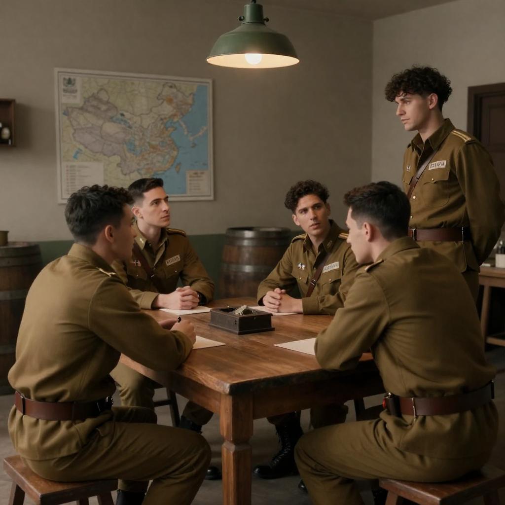 Photograph of six men in brown military-style uniforms in a dimly lit room. Five men sit at a wooden table, one man stands. Map on wall, green hanging lamps, wooden barrels in background. One man with curly hair looks at standing man, others engage in conversation. Stools under table.