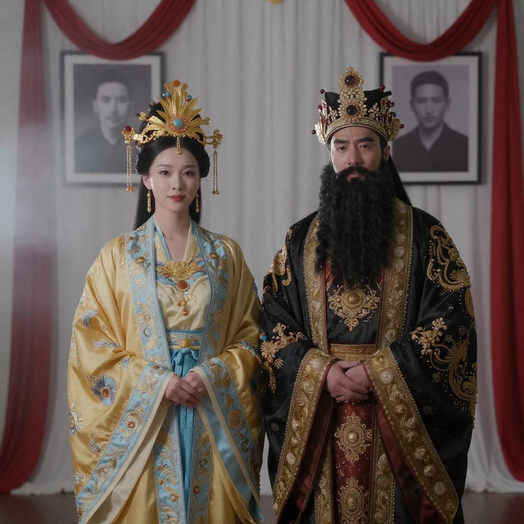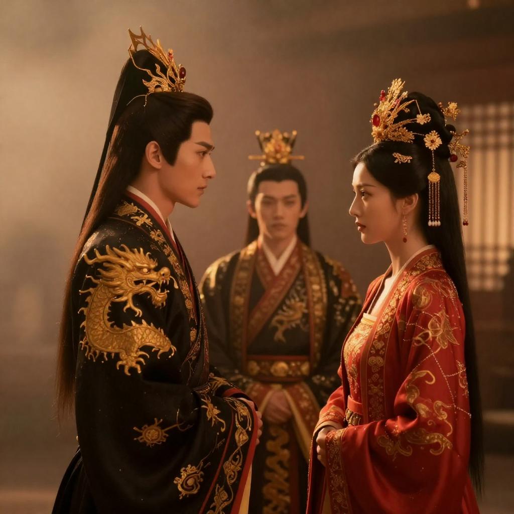 Photograph of three people in elaborate traditional Chinese costumes with intricate gold and black patterns. The central figure in black with dragon designs faces a woman with red and gold attire, both wearing ornate headdresses. A third person in similar attire stands in the background. Warm orange lighting, misty atmosphere. Central woman's intense expression, other figures' neutral expressions.