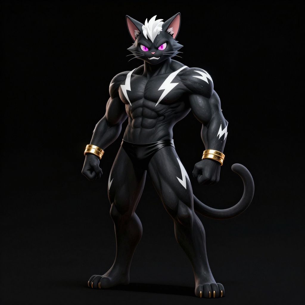 Digital art of a muscular, black-furred anthropomorphic cat with white lightning markings, purple eyes, gold bracelets, and a black loincloth,