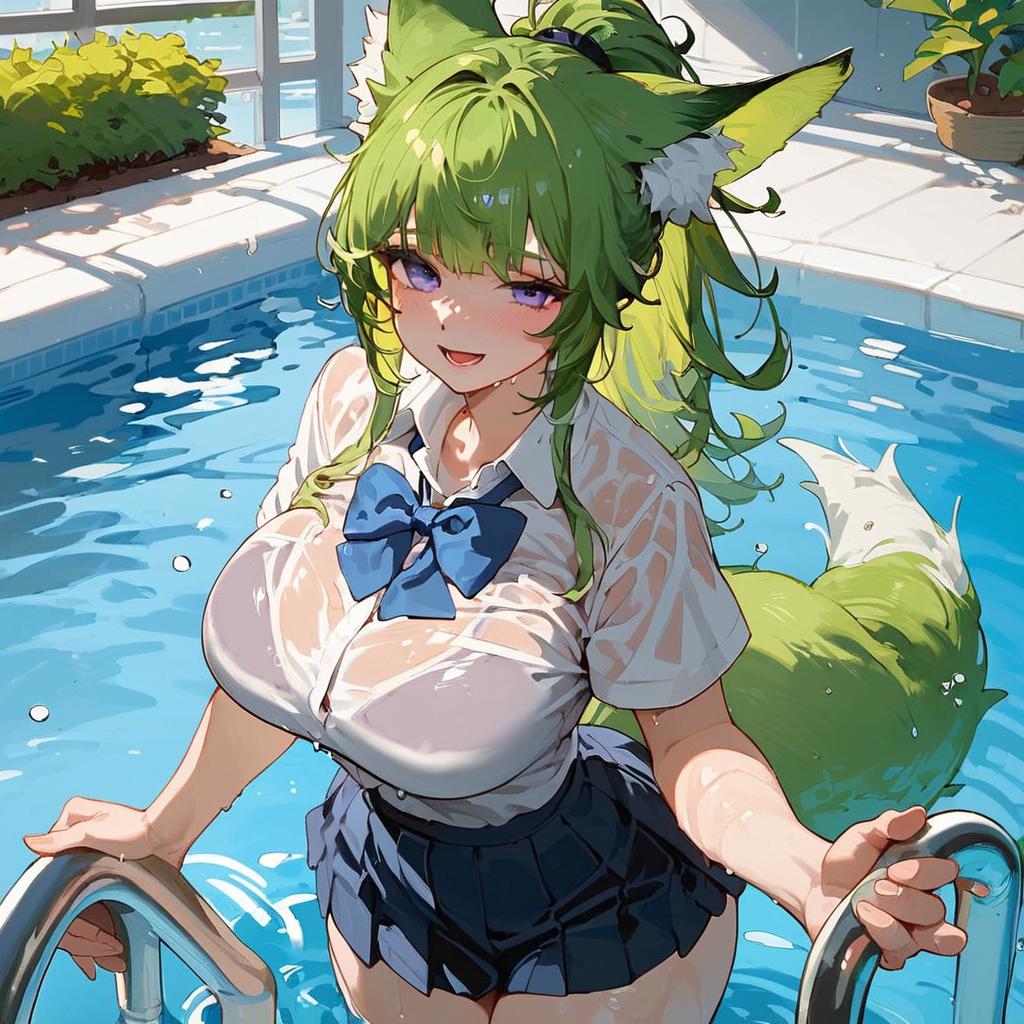Score_9, score_8_up, score_7_up, score_6_up, score_5_up, score_4_up, (source_anime), huge breasts, outdoors, from from above, foreshortening, night, shop, long hair, looking at viewer, blush, smile, open mouth, gloves, animal ears, cleavage, hair between eyes, jewelry, blue hair, purple eyes, pantyhose, fingerless gloves, pink eyes, mole, sweater, leotard, coat, clothing cutout, mole under eye, covered navel, turtleneck, cleavage cutout, ribbed sweater, yellow gloves, yellow sweater, purple pantyhose, yellow leotard