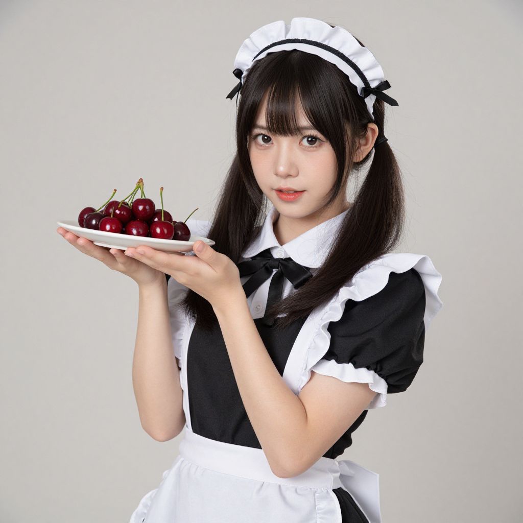A woman in a detailed anime-inspired maid outfit holds a plate of cherries, with a coy facial expression and a soft, studio-like lighting.