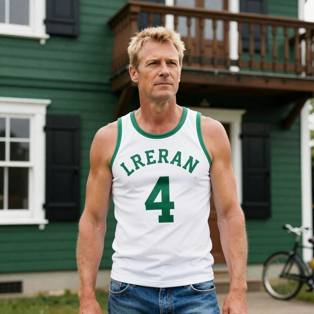 Middle-aged man with short blonde hair, wearing a white "Irish" tank top with number 4 and blue jeans, stands in front of a green wooden house with black shutters and a wooden balcony. He looks slightly to the side with a neutral expression. House has a "4" on the side, and a bike is partially visible on the right.