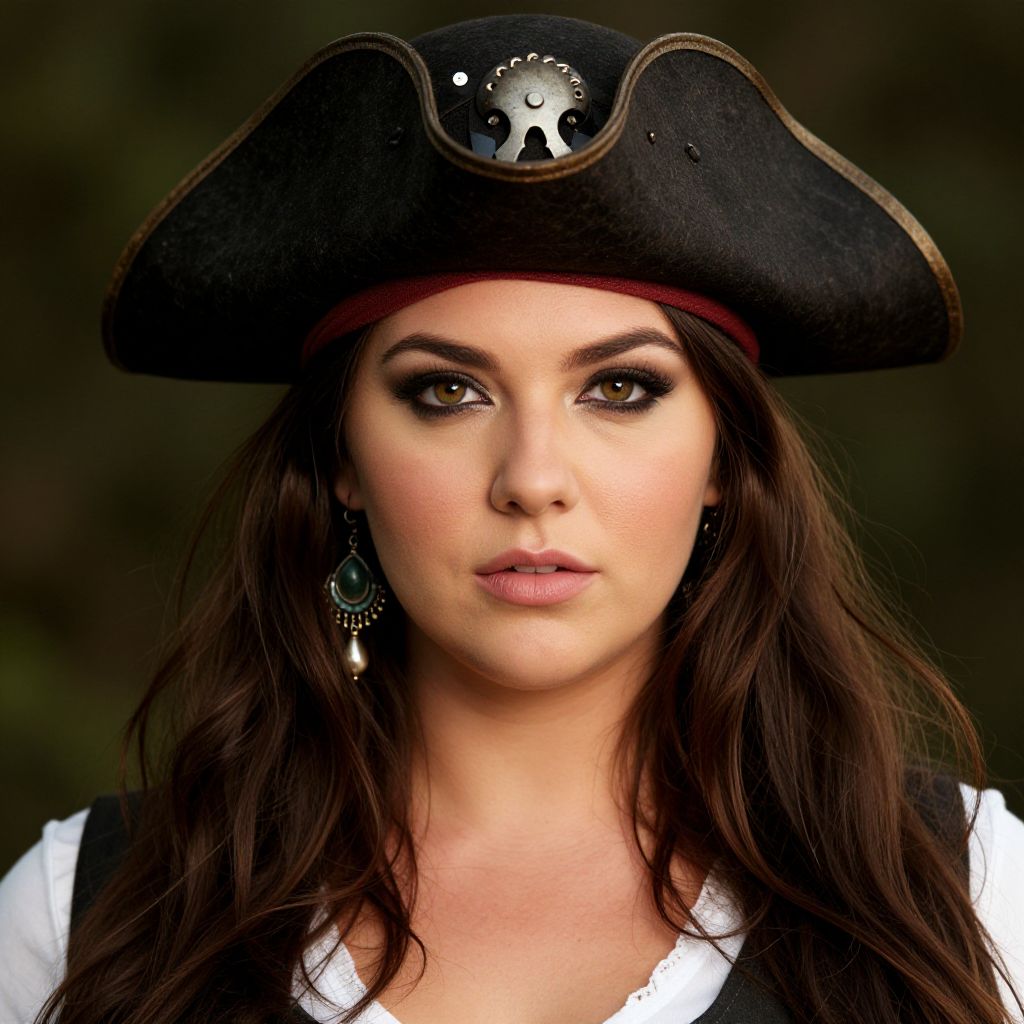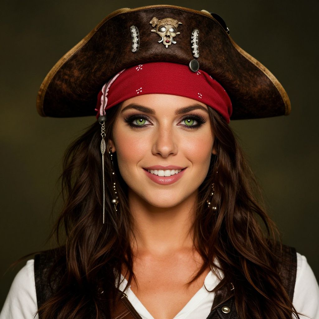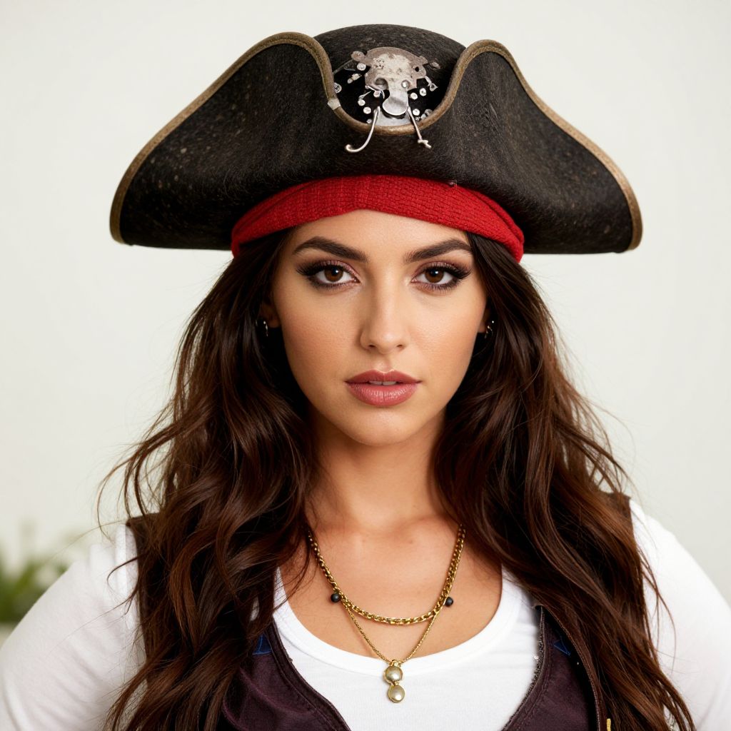 Photograph of a young woman with light olive skin and dark brown hair styled in two braids. She wears a black, tricorn-style pirate hat adorned with a silver skull and crossbones emblem. Her expression is neutral with slightly parted lips. She dons a white, button-down shirt with a black strap crossing her chest. The background is a solid, muted olive green. The lighting is even, highlighting her facial features and the details of her pirate attire. The image has a realistic, studio-portrait style.