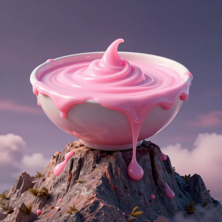 A surreal 3D-rendered scene depicts an enormous, otherworldly bowl perched atop a rugged mountain peak, filled with a mesmerizing swirl of pink, gelatinous substance that drips dramatically over its edges, evoking a fantastical blend of cosmic wonder and whimsical imagination.
