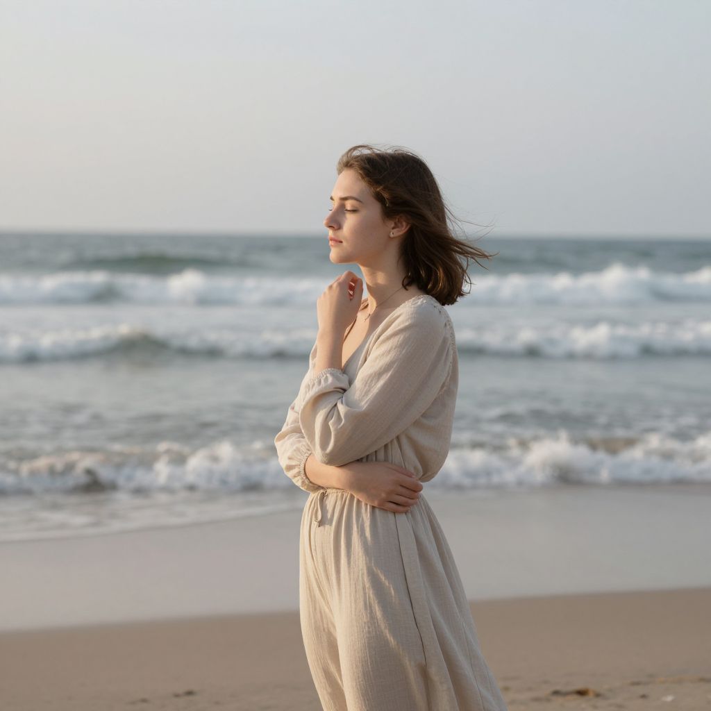 Amidst the rhythmic whisper of waves and the gentle hum of the breeze, a young woman finds solace in the embrace of serenity, her spirit anchored by the timeless dance of earth and sea.