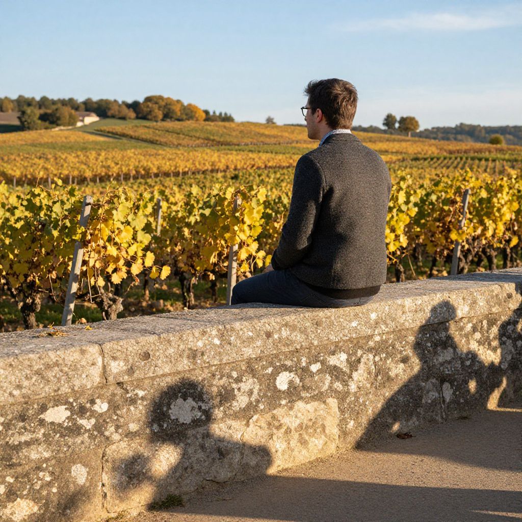 A peaceful daytime scene of a glass-like river winding through a quiet countryside, where the flowing water glimmers under sunlight, creating a rippling surface that reflects tall willow trees and soft hills in the distance. A man with a beard and kind eyes walks along the bank wearing a weathered hiking jacket.