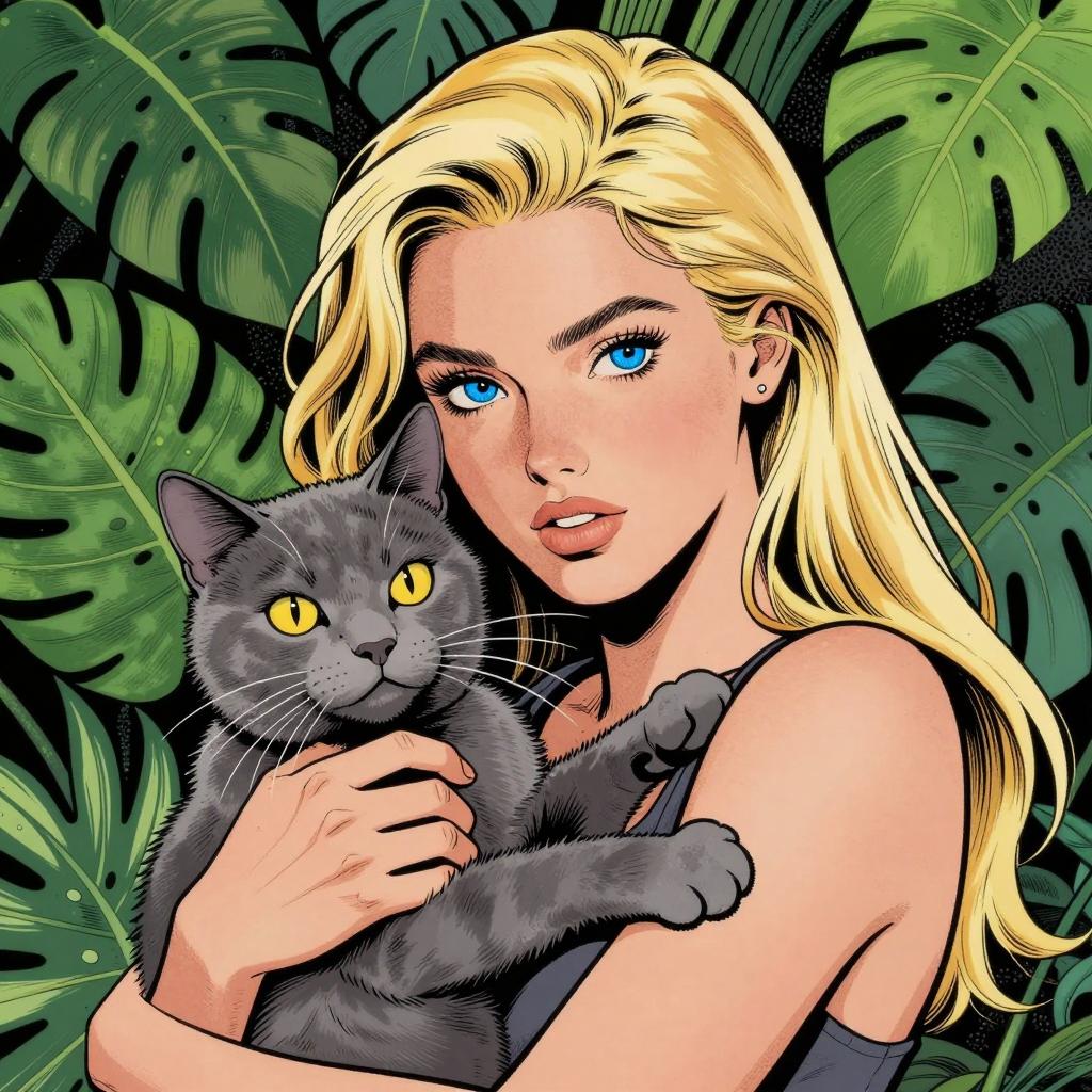 Digital illustration of a blonde woman with long wavy hair, blue eyes, and fair skin, wearing an off-the-shoulder dress with colorful swirl patterns. She holds a grey and white long-haired cat with blue eyes. The background is a vibrant, swirling mix of pastel colors and abstract shapes. Woman's expression is neutral, cat looks directly at the viewer. Woman's left hand rests on the cat's back, right arm wraps around it. Woman's dress has intricate beadwork and floral patterns. Artistically stylized, detailed, and colorful.