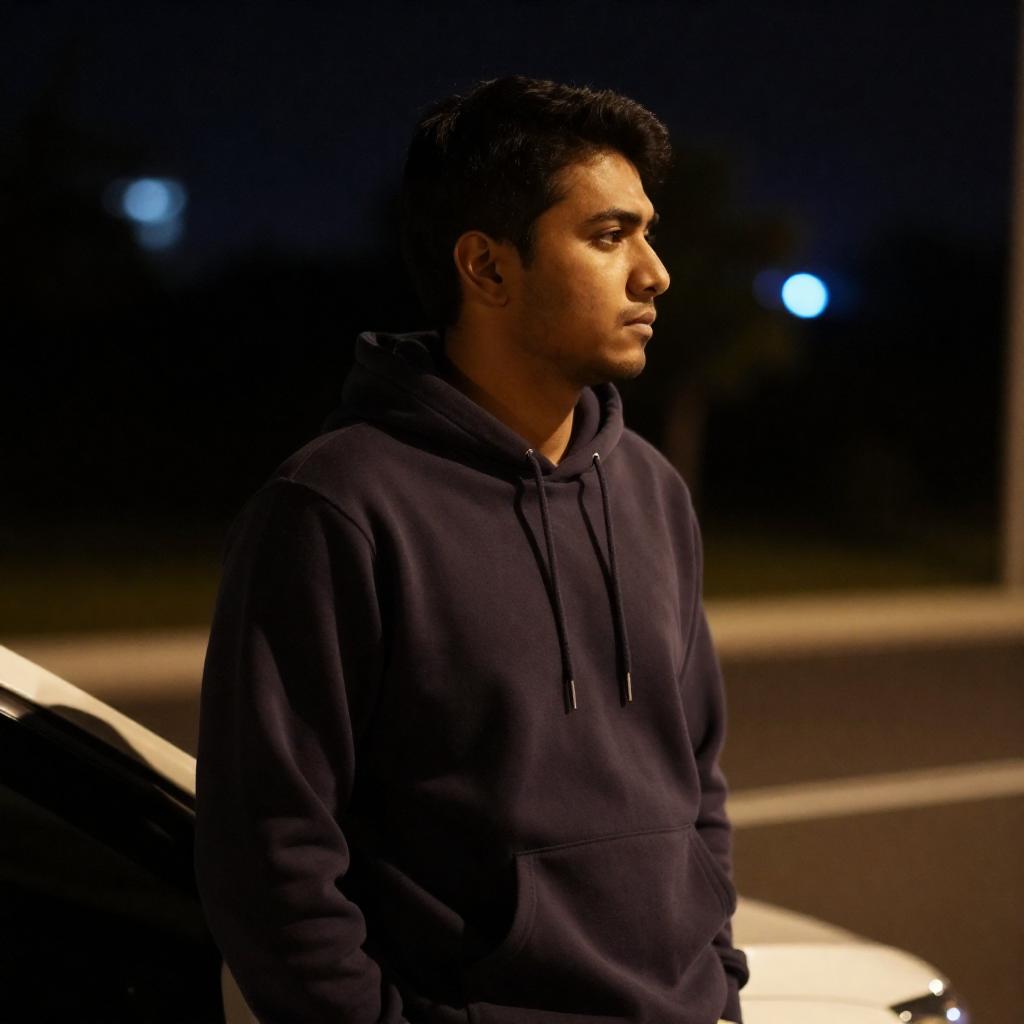 Profile view of a young dark-haired man wearing a navy hoodie, standing next to a white car at night. The serious-looking man is illuminated by side lighting, with a dark blurred background featuring distant blue lights and faint outlines of trees and street.