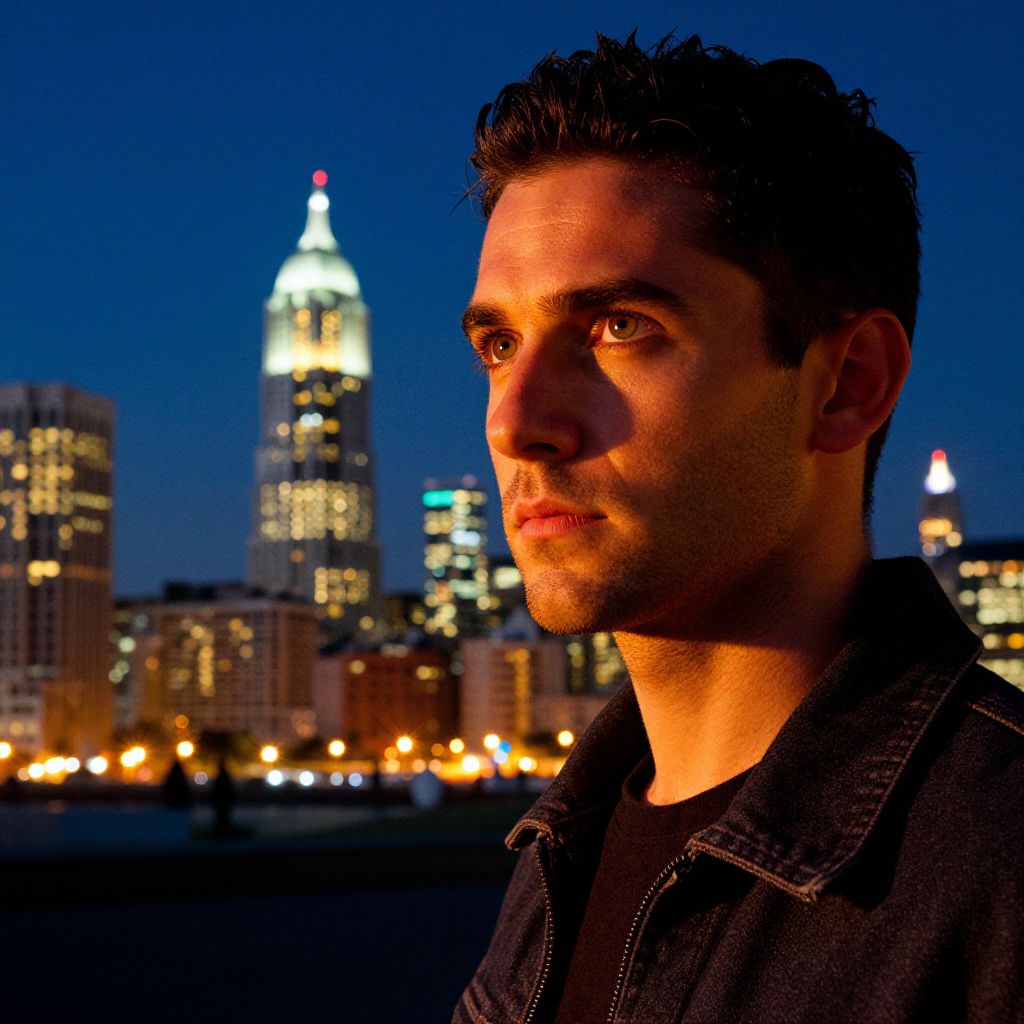 A photograph of a young man with short, dark curly hair and light skin, standing against a nighttime cityscape. He wears a dark denim jacket over a black shirt. The background features brightly lit skyscrapers, including a prominent tower with a glowing red tip, set against a deep blue sky. His face is illuminated with a warm, orange light, casting shadows that highlight his strong jawline and serious expression. The city lights create a vibrant contrast against the dark night.