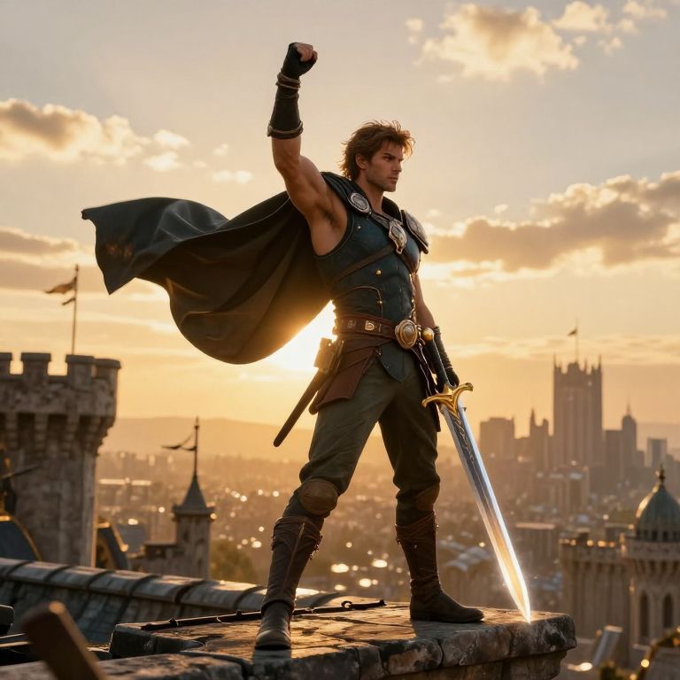 Asta's victory pose on a castle rooftop at sunset, cape fluttering in the wind, his anti-magic sword shining brightly, with a panoramic fantasy city skyline and golden sky behind him, highlighting courage and heroism.
