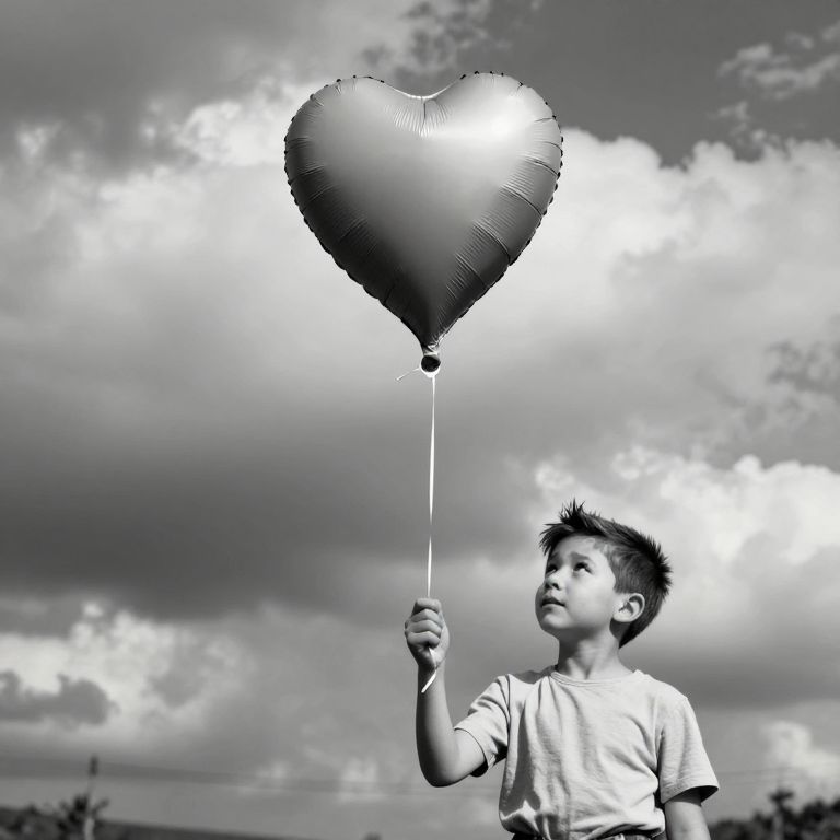 A young boy holds a heart-shaped balloon against a backdrop of strong winds and clouds, reminiscent of Dorothea Lange's style.