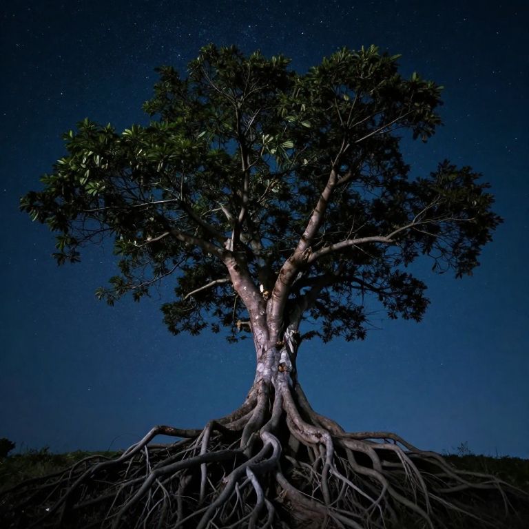A solitary, gnarled tree stands against a starry night sky, its intricate roots sprawling outward like branches reaching toward the cosmos, evoking a surreal, dreamlike atmosphere with dramatic lighting and a high-definition digital art aesthetic.