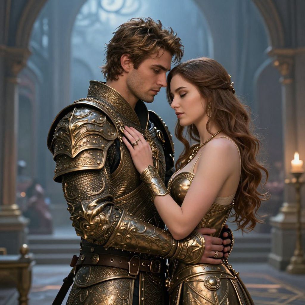 "Bronze Magic ideal couple, handsome warrior man is hugging a genuine perfect woman, magic world at the background, hyper detailed, hyper realistic, fantasy style, Art Station, Dream Art,"