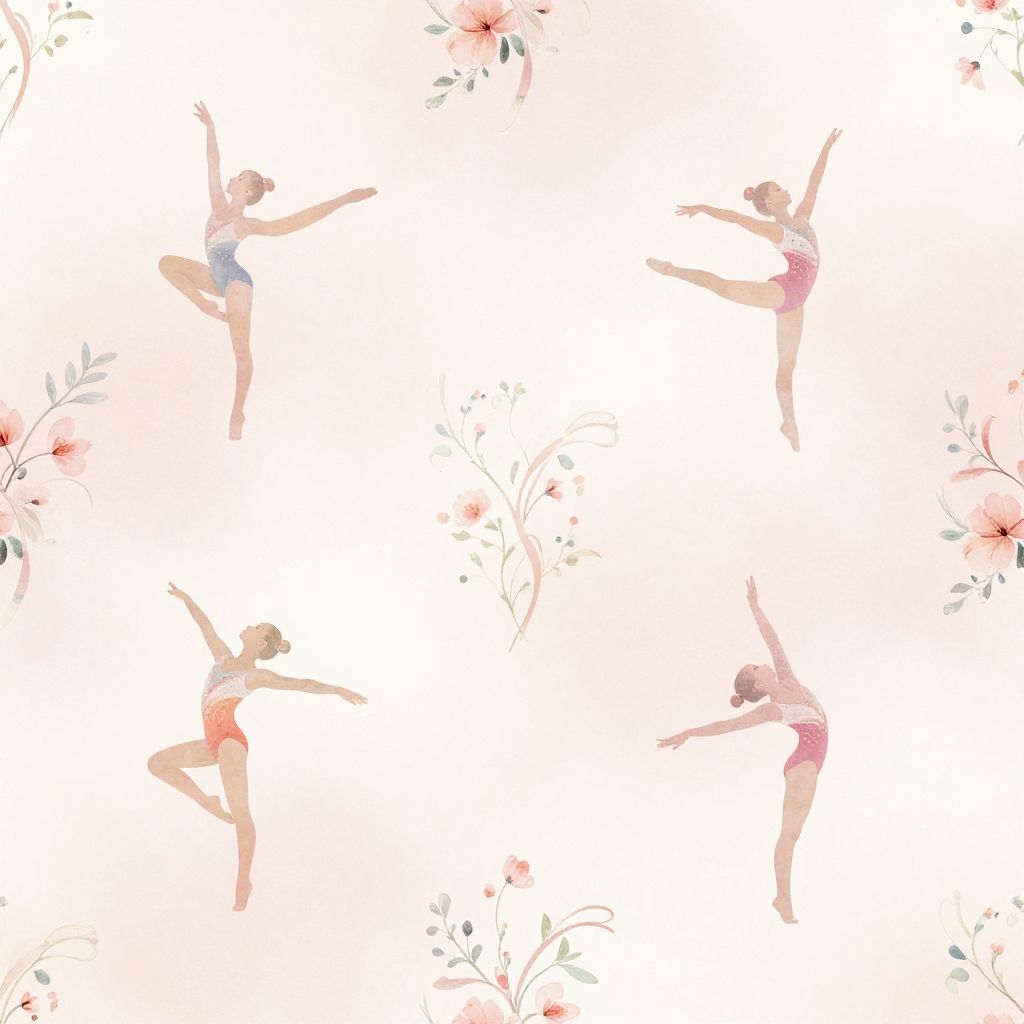 Gymnastics wallpaper aesthetic featuring a soft pastel color palette, elegant silhouettes of gymnasts performing graceful routines, delicate floral patterns intertwined with ribbons, and a dreamy, ethereal background creating a calming and inspiring atmosphere.