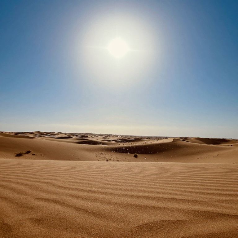 Photograph of a sunlit desert with rippled sand dunes, clear blue sky, and bright sun in the upper center.
