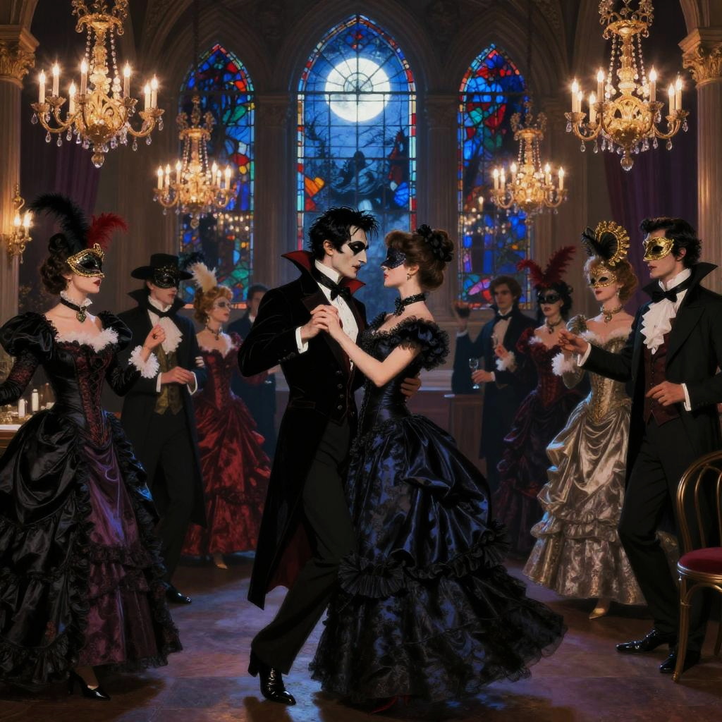 Victorian vampire painting of a nocturnal ball attended by vampires in lavish Victorian attire, chandeliers casting sparkling light, ornate masks and corsets, a vampire couple dancing under a full moon through large stained glass windows, rich color palette emphasizing mystery and elegance.