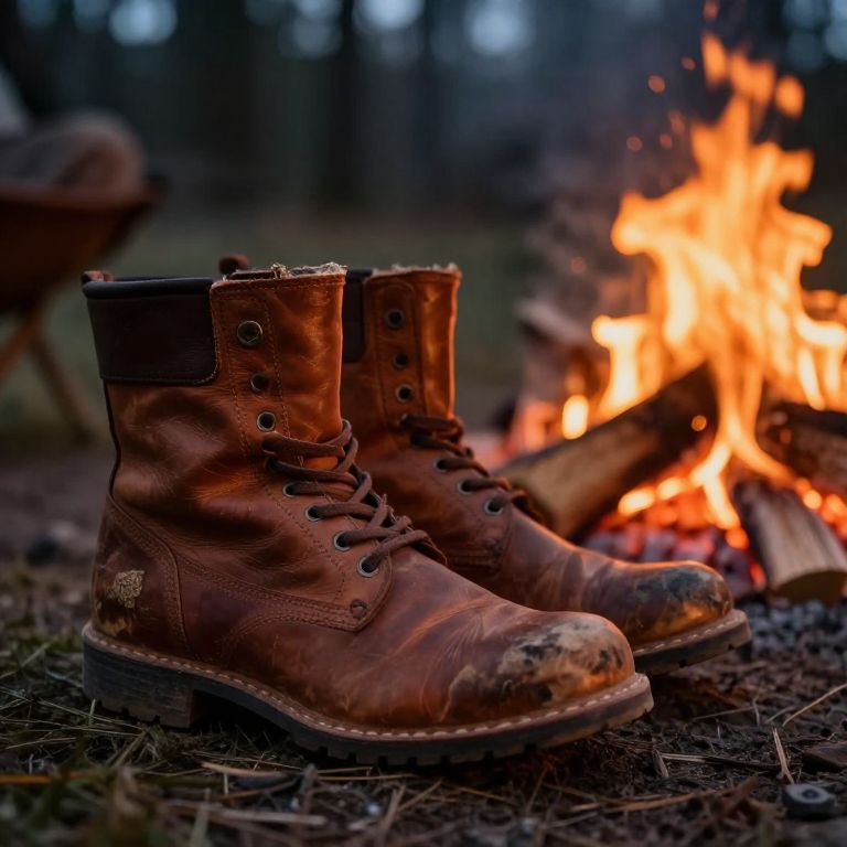 Vintage stiefel placed beside a roaring campfire at dusk, warm orange flames casting dynamic shadows on distressed leather, cozy outdoor adventure scene, realistic textures and warm color palette