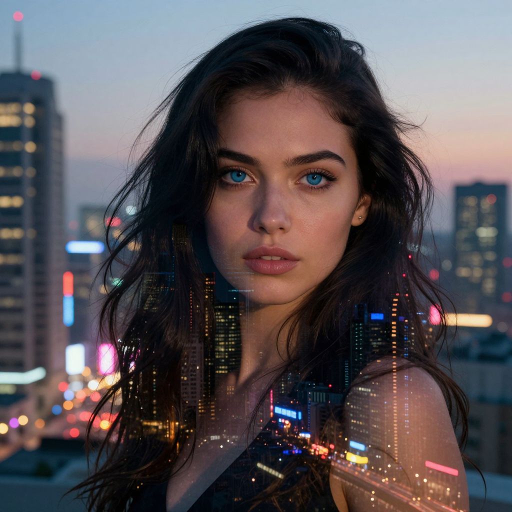 A captivating double exposure portrait captures a striking woman with piercing blue eyes and flowing dark hair seamlessly merging into a bustling cityscape at dusk. Her translucent features reveal the vibrant lights and towering skyscrapers of the urban landscape behind her. The twinkling neon signs of the city blur into her cascading locks, while its background subtly blends with her enigmatic gaze. This high-definition portrait evokes a sense of intrigue and mystery, inviting viewers to explore the emotional gradient where serenity meets urgency within this luminous fusion of nature's beauty and the concrete jungle.