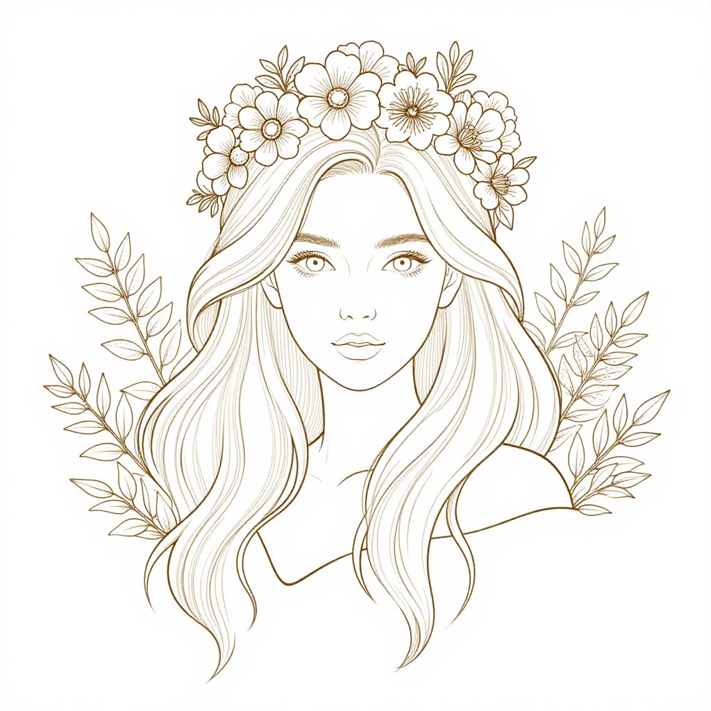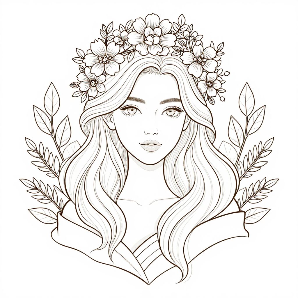 Elegant line art of a woman with flowing hair adorned by a intricate floral crown, surrounded by delicate foliage, ready for detailed coloring.