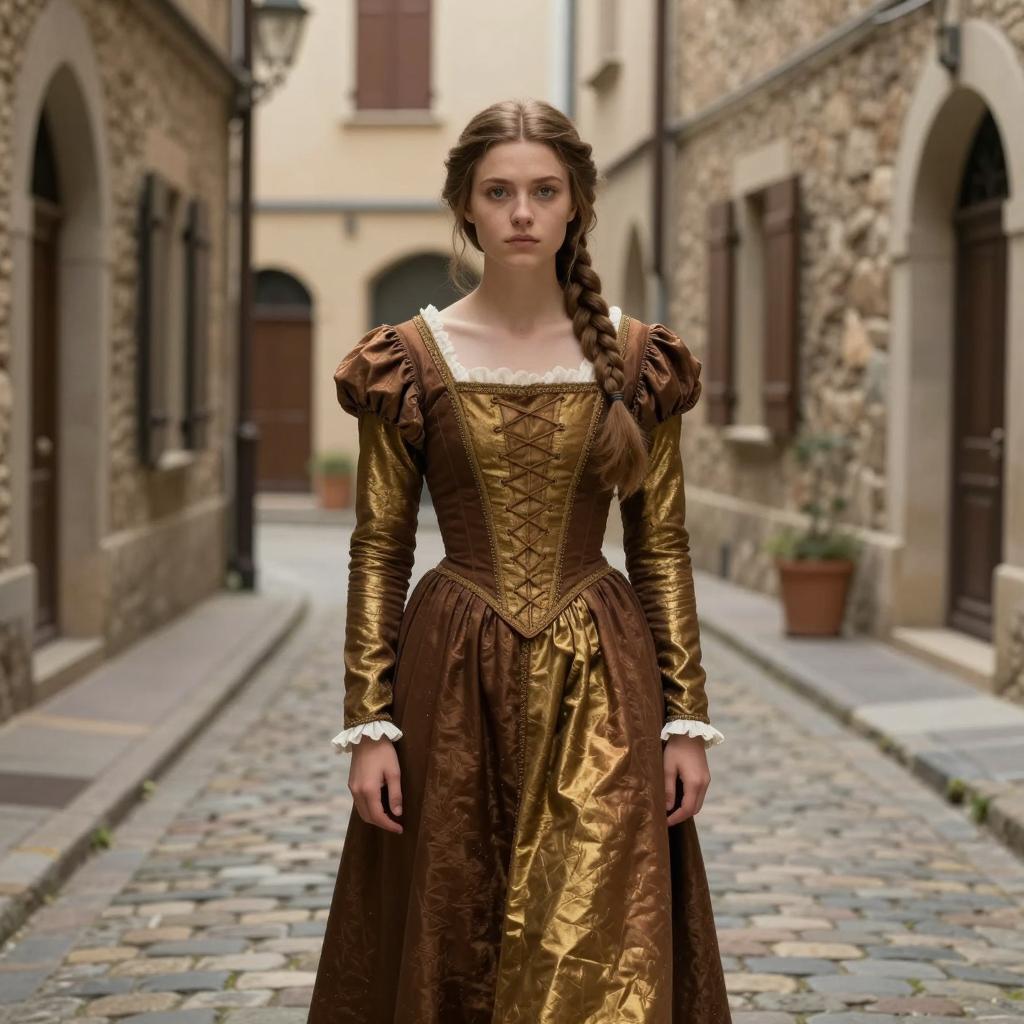 Fancy dress outfit, photorealistic, young woman, Renaissance-style dress, intricate embroidery, green and orange fabric, puffed sleeves, golden buttons, floral headpiece, long wavy brown hair, fair skin, serious expression, outdoor setting, blurred background with people and street lamps, evening light, realistic ures, detailed clothing, traditional European fashion, medieval aesthetic, portrait, centered composition