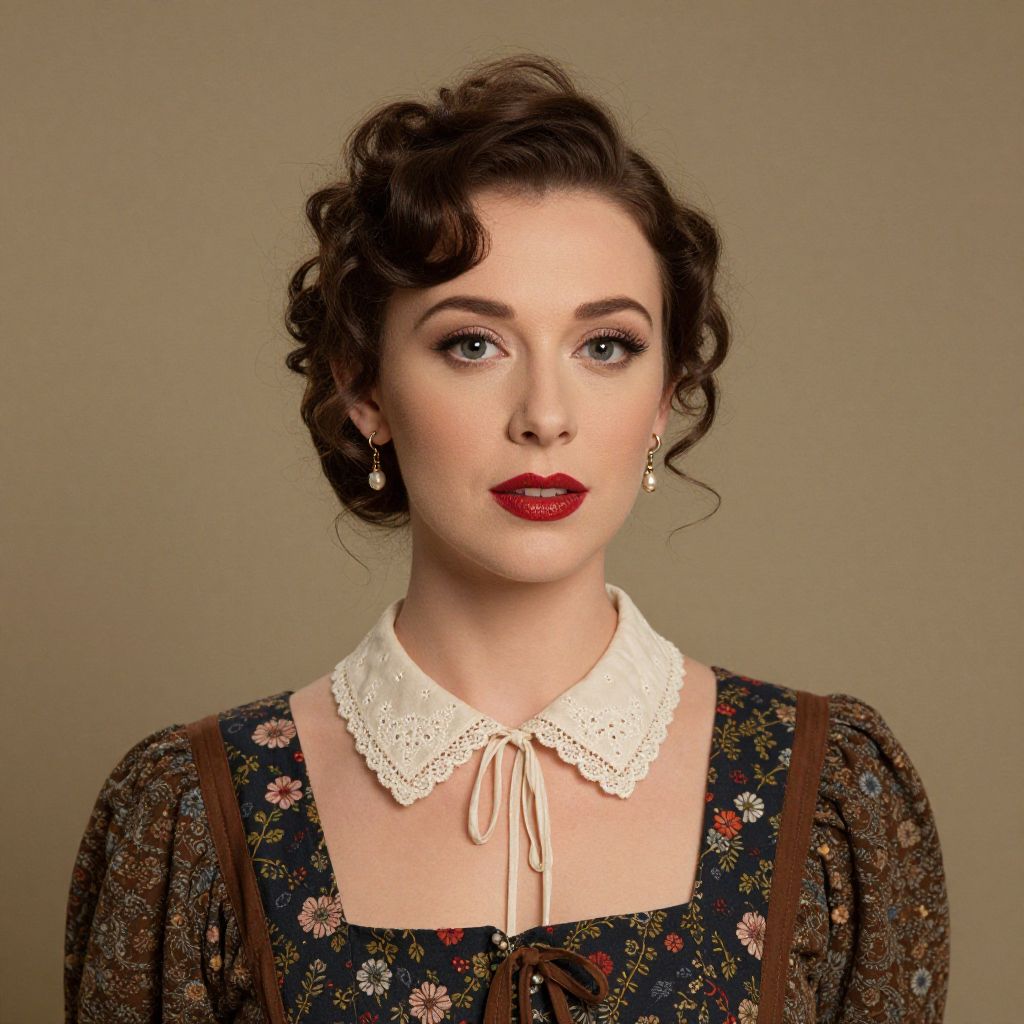 An artistic portrait of a woman dressed in a vintage-inspired outfit with Kodak Portra-like tones, showcasing intricate details and a classic aesthetic.