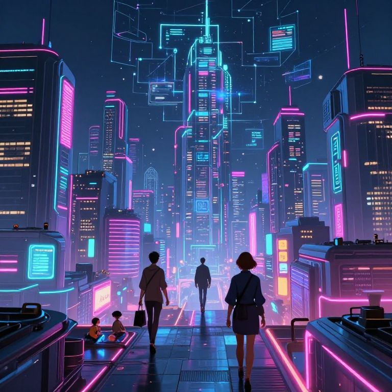 A digital artwork depicts a neon-lit, futuristic cityscape at night. Three people, two adults and one child, walk down a brightly illuminated street, their silhouettes visible against the vibrant, colorful city lights. The buildings are adorned with glowing pink, blue, and purple neon signs, and floating holographic grids illuminate the sky. The adults wear casual attire; the child holds an adult's hand. The street features glowing pink and blue lights embedded in the pavement. The overall style is cyberpunk with a high-tech, neon aesthetic.