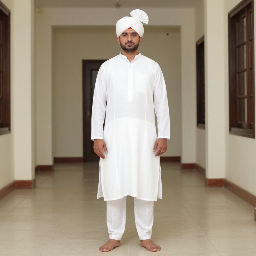 Kathak Costume White, man in a white outfit and turban standing in a hallway