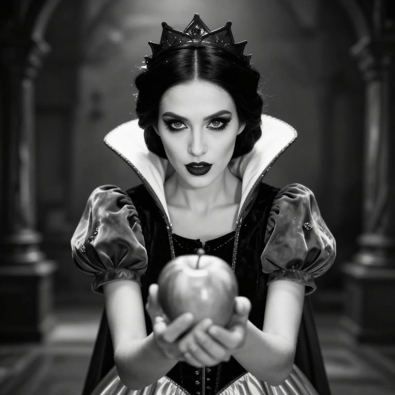 Wide-Angle Perspective beautiful evil queen from snow white holding a apple , gleaming eyes in live action black and white photography centered composition,