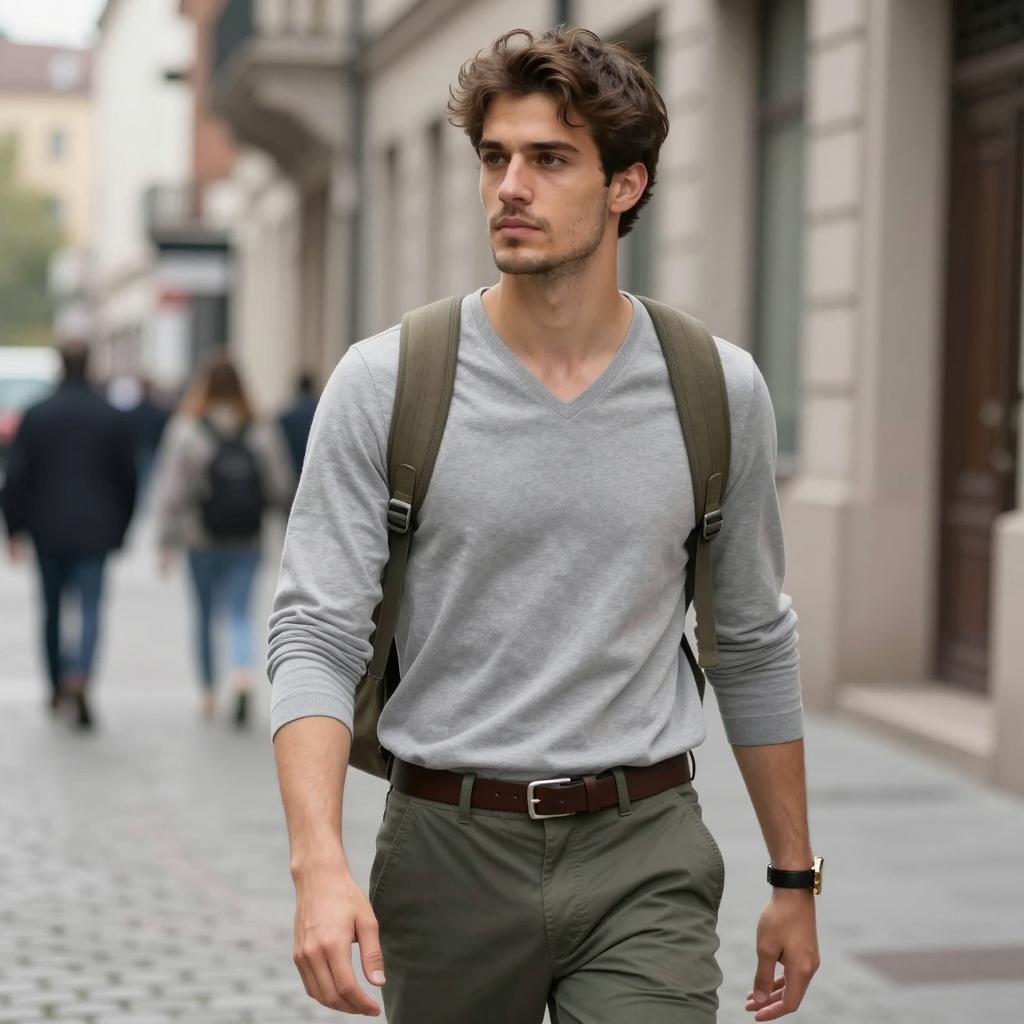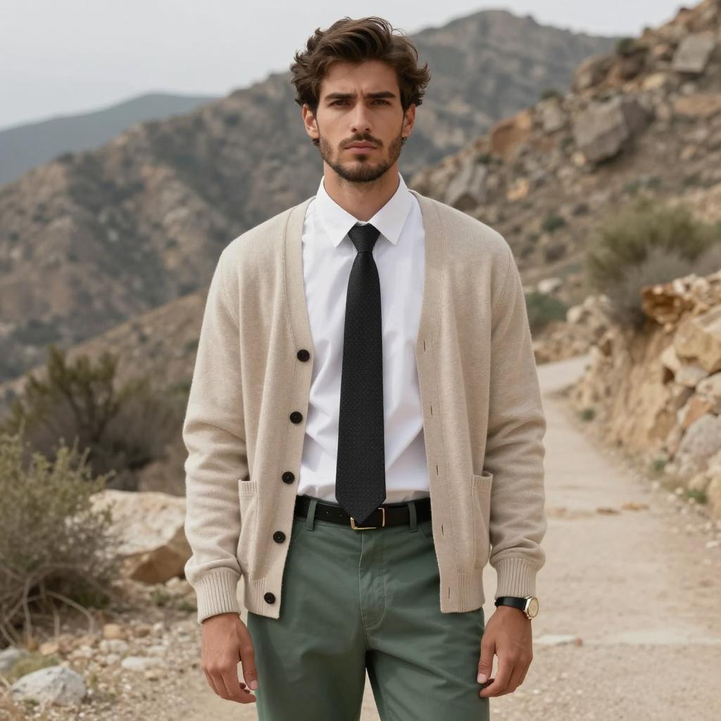 Sam apocalypse costume, photorealistic portrait of handsome man, short brown hair, light stubble, intense gaze, wearing orange shirt, black jacket, orange scarf with hood up, blue sky background, sunlight, slight breeze, modern fashion, realistic ures, detailed, medium shot, slightly blurred background, casual style