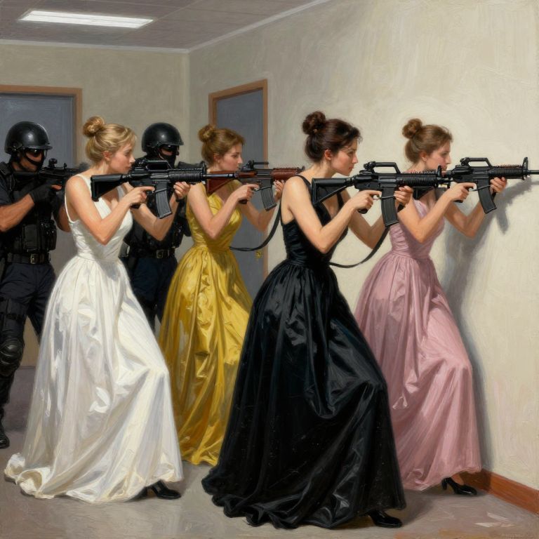 A digital painting depicts five women in elegant, floor-length dresses—white, yellow, black, and pink—standing in a white-walled room, aiming black rifles at a wall. A man in black tactical gear and a helmet stands behind them, holding a rifle. The women's hair is styled in updos, and the dresses have a glossy, satin texture. The room has simple decor with two closed doors in the background. The lighting is bright, casting soft shadows. The style is realistic with a slightly dramatic, action-oriented composition.