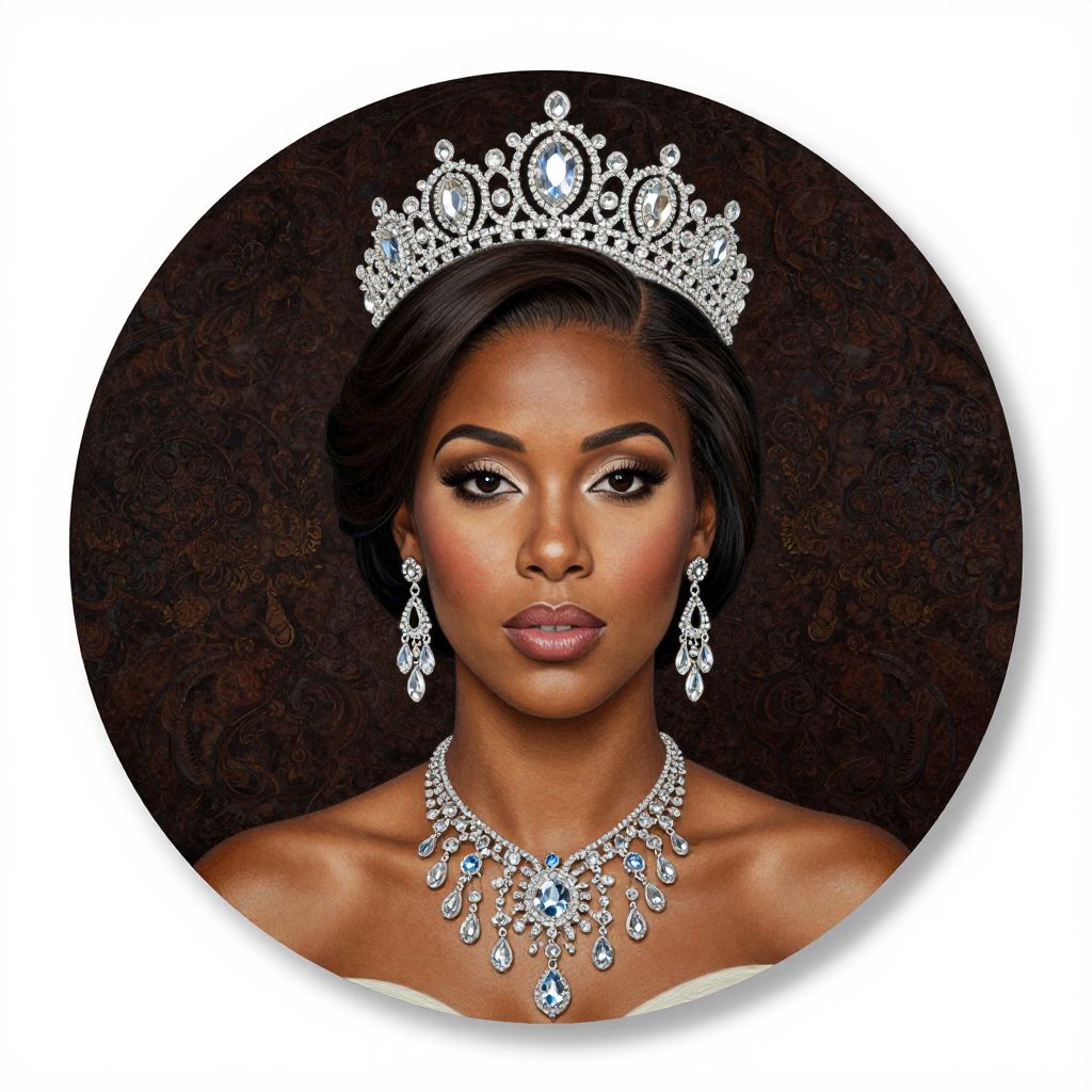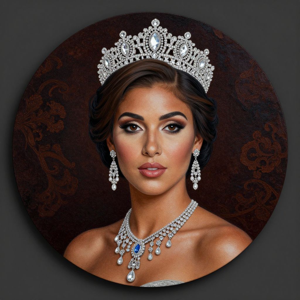 Circular artwork titled \"Round Canvas: Regal Lady,\" showcasing a finely detailed portrait by Rentia Coetzee, featuring a woman adorned with a sparkling tiara, dangling earrings, and a luxurious necklace, set against a richly textured dark background.