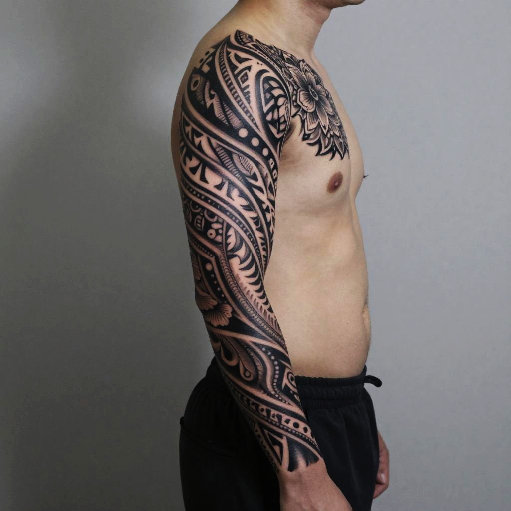 Tattoo art ai generator creating intricate black and gray sleeve designs blending tribal patterns and floral motifs, high detail, realistic shading, hyperrealistic style with a modern digital art twist, 4k resolution