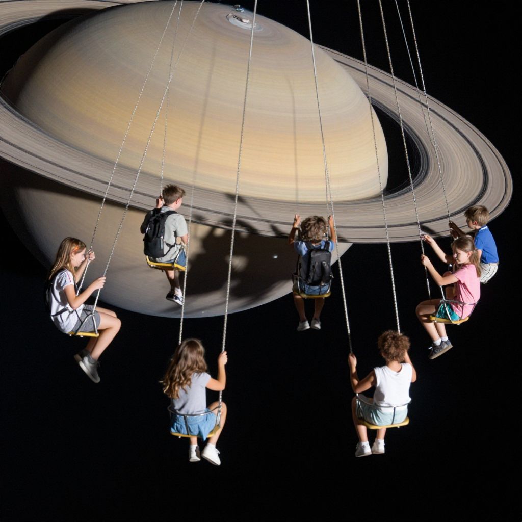 Children on a never-ending swing ride hover beside Saturn’s rings, each push sending ripples through space-time.