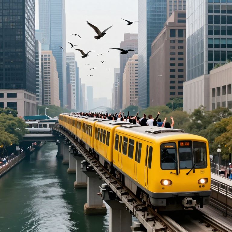 Vibrant yellow trains carry crowds of cheering passengers as they traverse elevated tracks, flanked by towering skyscrapers and mirrored by a serene waterway, while flocks of birds soar above in a surreal urban landscape.