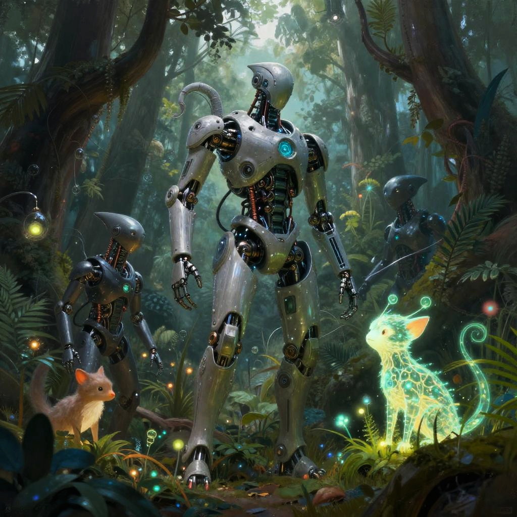 Digital art of glowing, neon-lit, humanoid robots interacting in a lush, bioluminescent forest, surrounded by vibrant, colorful plants.