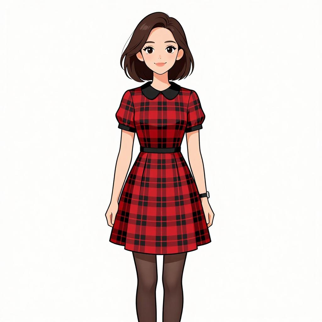 Woman with pretty face and pretty hair. smiling Woman, preppy with a twist, charcoal grey cardigan, black bow-tie at neck, black and white micro houndstooth print shirt, high-waisted wool skirt in a blue and orange plaid pattern, thigh-high black stockings, animal print shoulder bag with leather strap, minimal makeup, hair loosely tied back, white studio background. --sref 1467