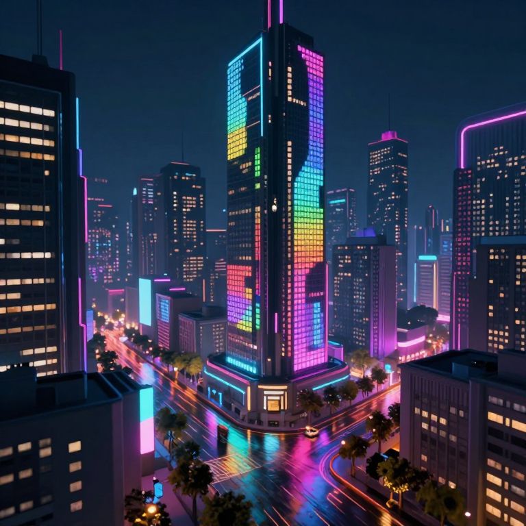 This digital artwork depicts a vibrant, neon-lit cityscape at night. The central focus is a tall skyscraper with a colorful, gradient LED display in hues of blue, green, yellow, and pink. Surrounding buildings are also illuminated with bright neon lights, primarily in shades of purple, blue, and pink. The streets below are filled with light trails from moving vehicles, adding a sense of dynamism. Trees line the streets, and traffic lights glow red, yellow, and green. The sky is dark, emphasizing the city's bright, futuristic lighting. The overall style is reminiscent of cyberpunk aesthetics, with sharp lines and vivid colors.