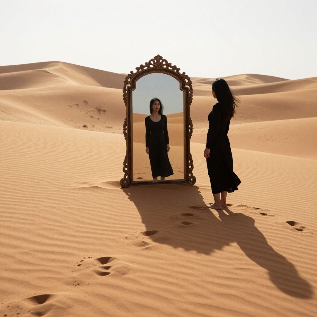 Silhouetted woman in black dress stands in desert, facing ornate mirror reflecting her image, with sunlit sand dunes in background.