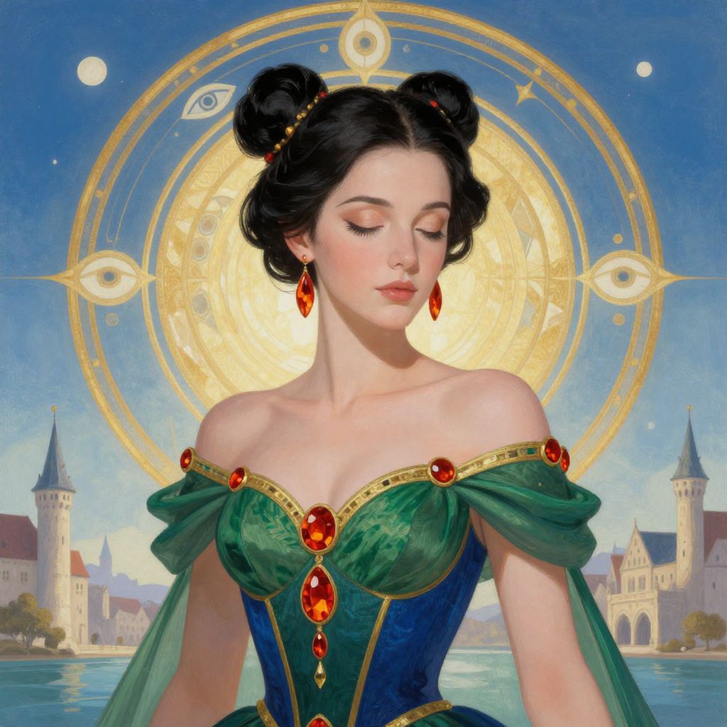 A digital painting of an Asian woman with fair skin and black hair in a bun, sitting on a wooden swing against a twilight landscape. She wears a white, short-sleeved blouse with gold embroidery, a red scarf with intricate patterns, and a multicolored, patterned skirt. She has gold bracelets and a large, red gemstone necklace. Her hands grip the rope of the swing. The background shows a mountainous horizon with a colorful sunset, and the foreground has vibrant flowers. The image has a whimsical, fairy-tale-like style.