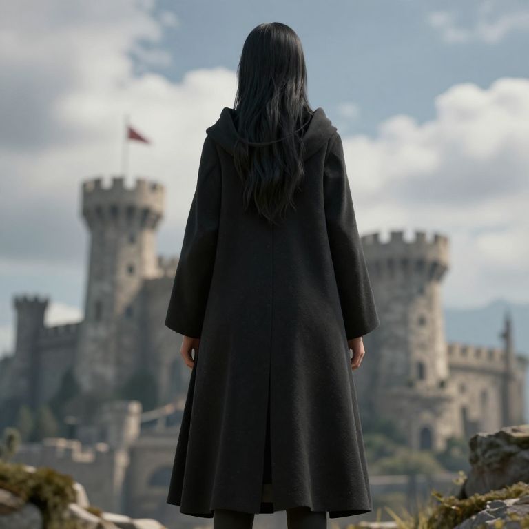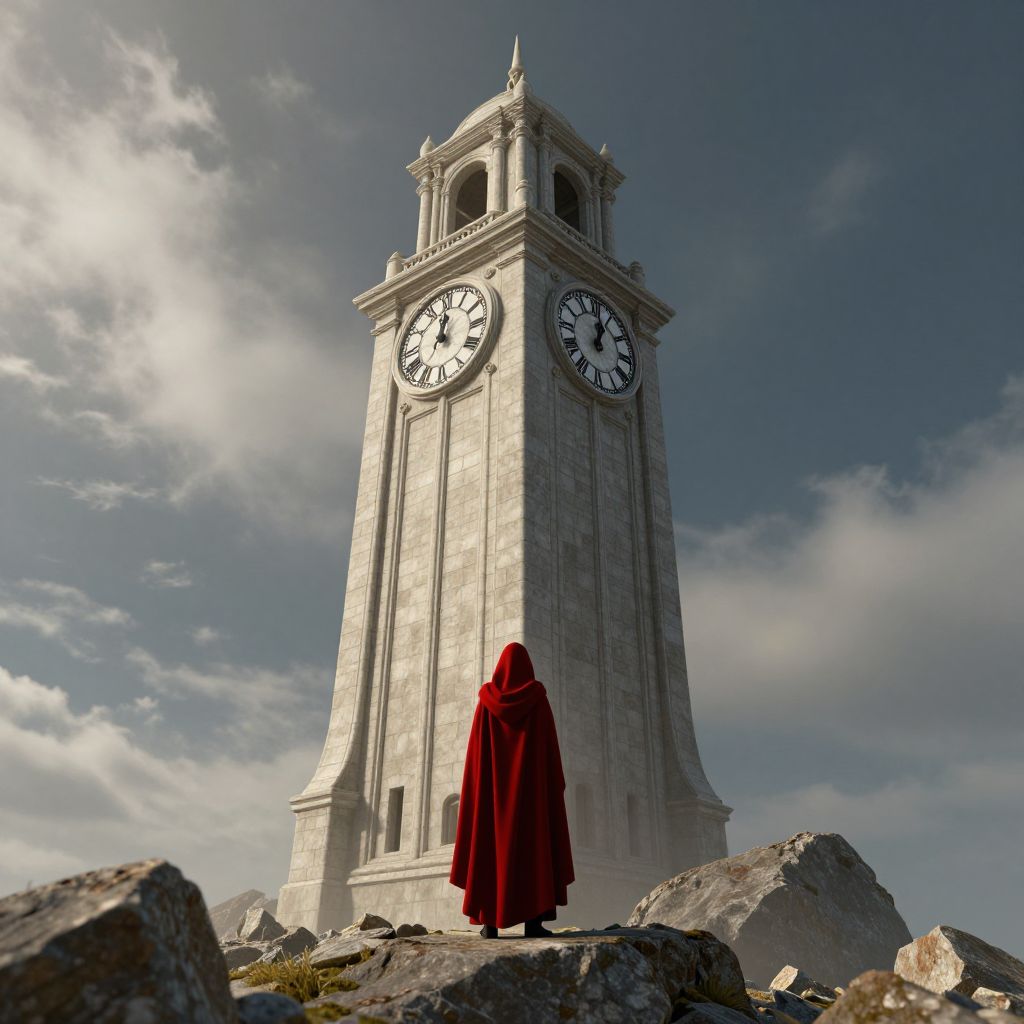Photograph of a tall, white stone clock tower with two large, black clock faces under a bright, partly cloudy sky. A person in a deep red, hooded cloak stands in the foreground on rocky terrain, facing the tower. The tower's architecture is classical, with ornate details at the top. The sunlight casts shadows, highlighting the tower's texture and the rocky ground. The person's cloak contrasts sharply with the white tower and the blue sky, adding a dramatic, mysterious element to the scene. The overall mood is somber and enigmatic.