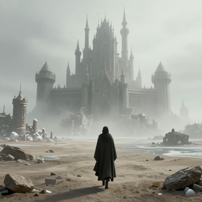 An ethereal 3D-rendered scene depicts a majestic stone clock tower emerging from a rocky outcrop, its Roman numeral clocks facing outward under a dramatic sky, while a solitary figure draped in a vibrant red cloak stands contemplatively before it, evoking a sense of timeless mystery and forgotten lore.