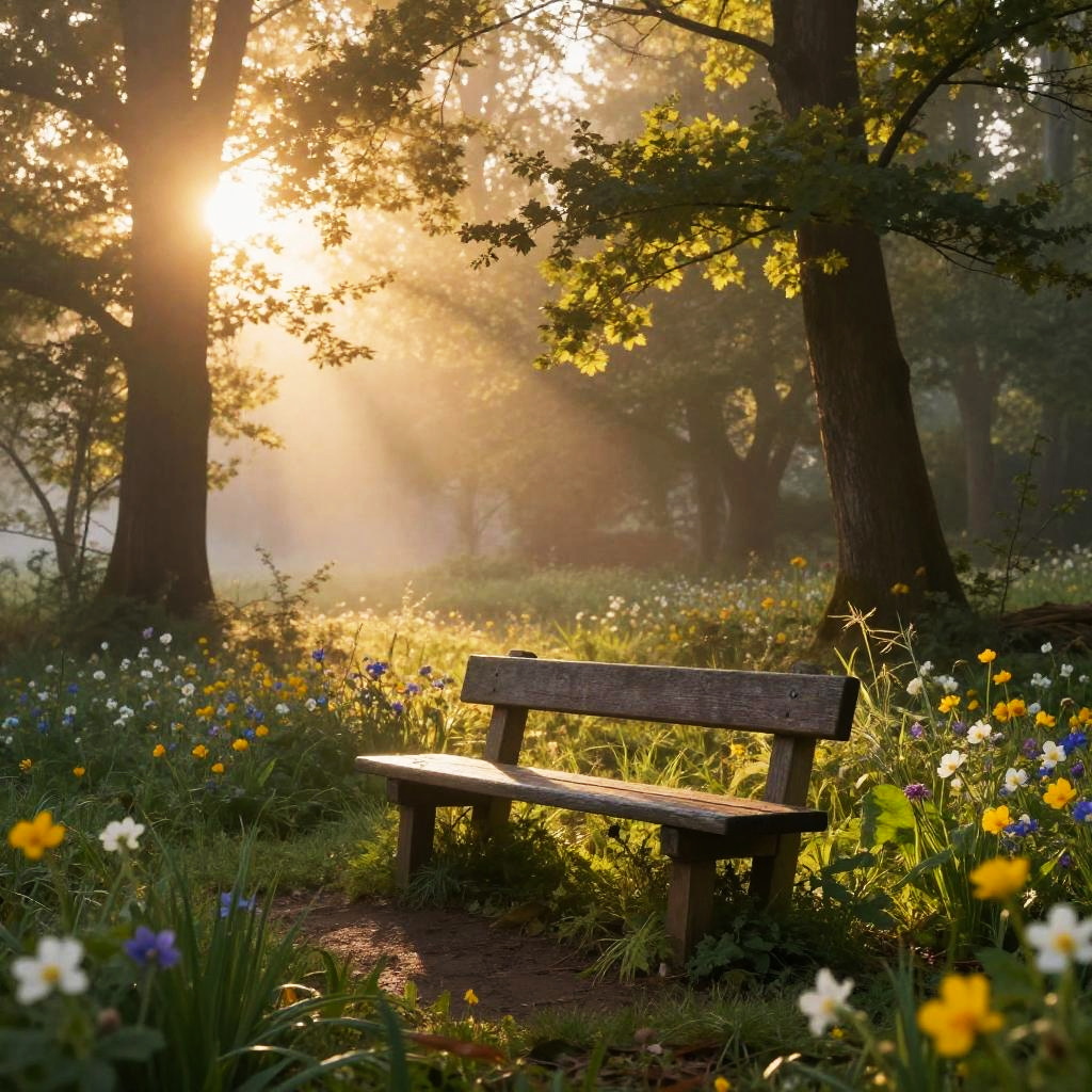 Here in a serene forest clearing at dawn, golden sunlight filters through misty trees, illuminating a small wooden bench surrounded by blooming wildflowers, evoking a peaceful, magical atmosphere, detailed and vibrant landscape art style.