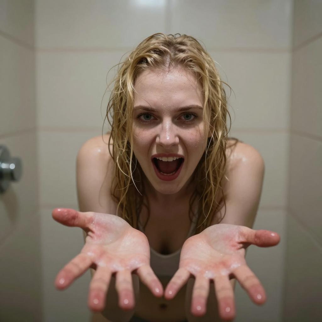 A young woman with wet, dirty blonde hair in a dimly lit shower stall. She is naked, leaning forward with an intense, open-mouthed expression. Her hands are extended towards the camera with fingers spread. Pale skin, visible red marks on her hands. Beige tiled walls in the background.