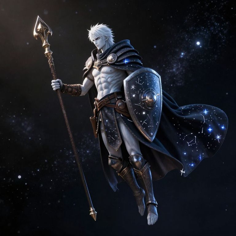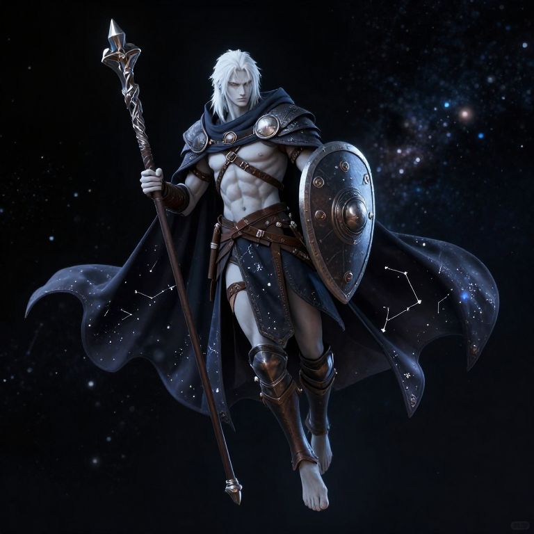 Digital fantasy artwork of a muscular, white-haired warrior with a starry black cape, holding a spear and shield, against a starry night sky background