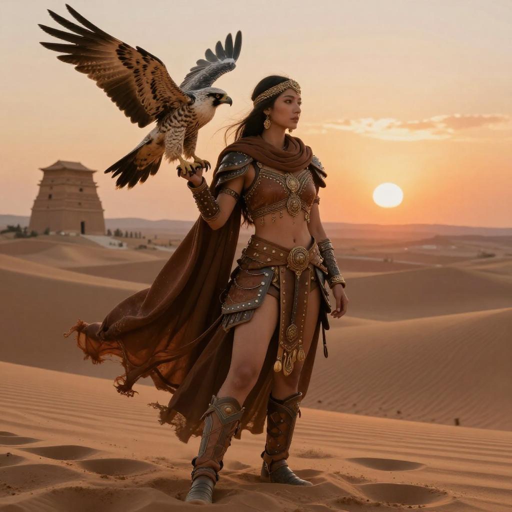 Modelshoot style, (extremely detailed CG unity 8k wallpaper), full body shot of desert nomad huntress goddess in ornate leather armor with flowing scarves and a perched falcon, vast sun-scorched dunes with a ruined sandstone ziggurat on the horizon under a blazing orange sunset, professional majestic oil painting by Loish and Feng Zhu, Studio Ghibli, trending on ArtStation and CGSociety, intricate, high detail, sharp focus, cinematic lighting, photorealistic art by midjourney and Greg Rutkowski