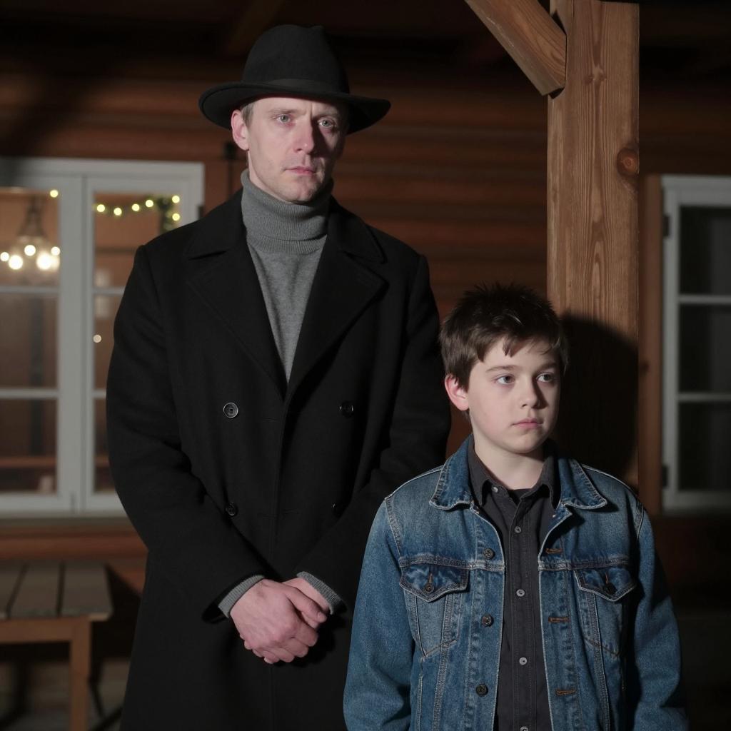 Photograph of two people in a dimly lit wooden building. Adult man with pale skin, black hat, gray turtleneck, and black coat, standing slightly behind a young boy with short dark hair, light skin, denim jacket, and dark shirt. Man's hands are clasped, boy looks to the right with a serious expression. Background includes a window with Christmas lights and a wooden pillar.